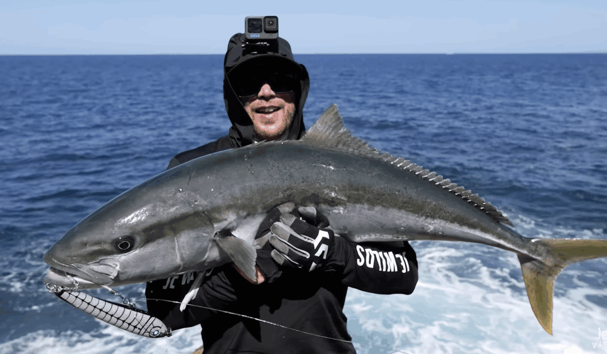 A kingfish swims past our feet and I drop a lure right on top of it!